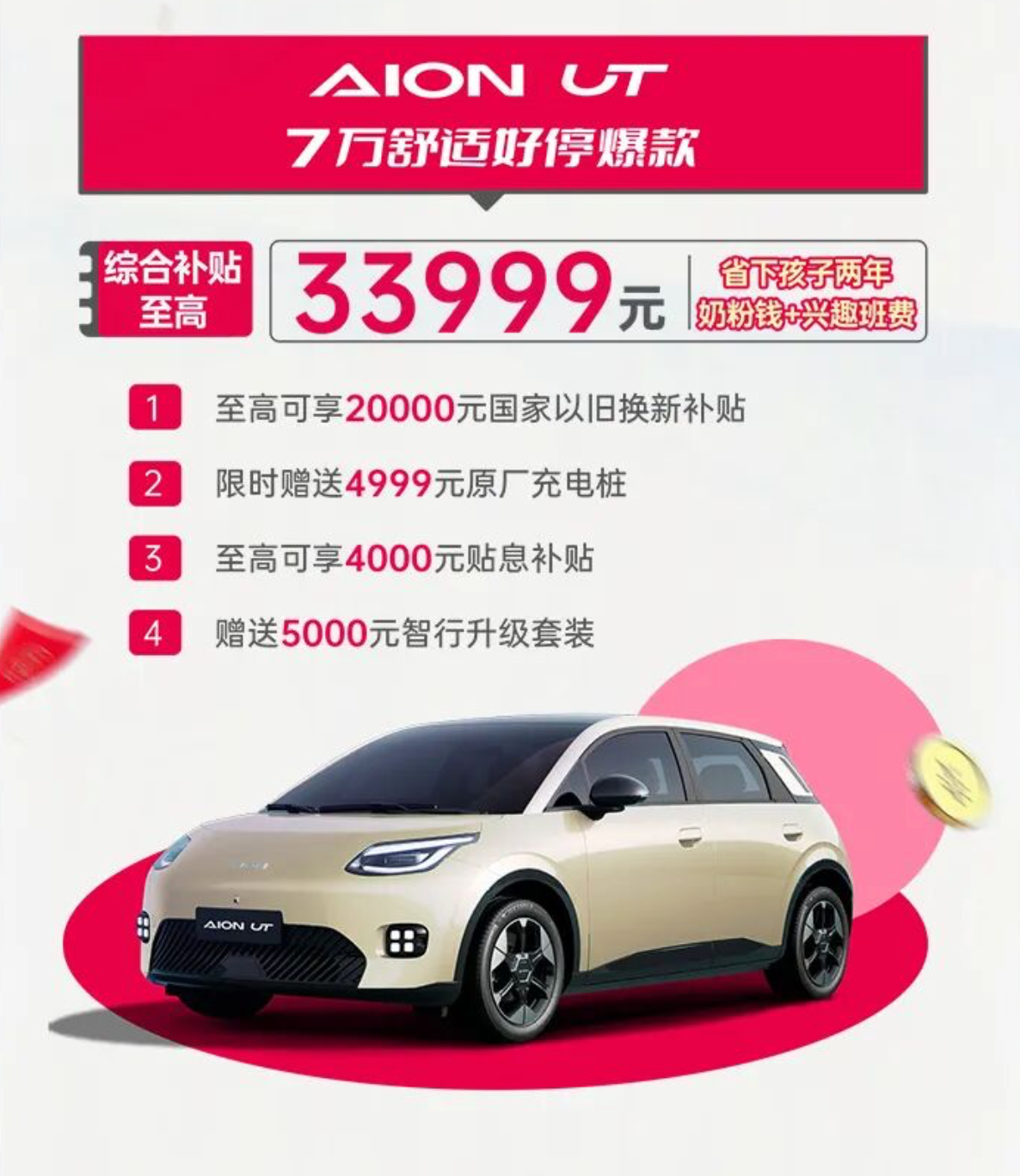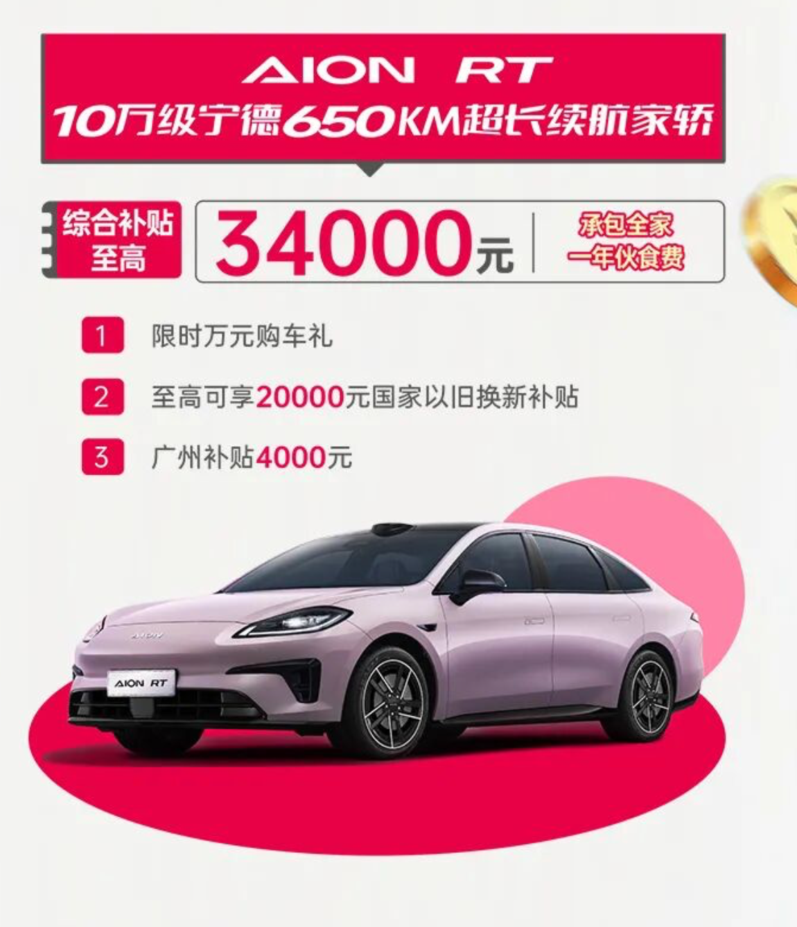 目前,已经有企业积极响应,广汽埃安加码优惠政策,购买AION UT综合补贴至高33999元,购买AION RT综合补贴至高34000元,购买AION Y PLUS综合补贴至高30000元。