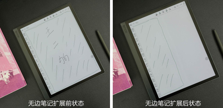这里二狗单独说说新升级的无边笔记功能。记录页面空间不足时,通过调整页面就可以实现“无边”扩展。扩展后就有了新的创作空间,可以明显看到之间的笔记边界变成了新笔记中间的一部分,支持多次扩展实现更多内容记录。创作内容时的连续灵感,搭配文石这个无边笔记功能可以轻松记录且思路不被打断。