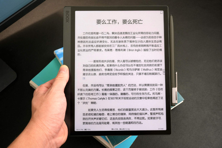 作为一款10.3英寸的大尺寸墨水屏,整体重量却控制在了440g。算不上轻盈,不过对比规格相近的平板来说确实轻了不少。上手实际触感不错,金属质感很舒适。不过长时间单手握持还是有些累手,建议搭配带支架功能的保护壳使用。