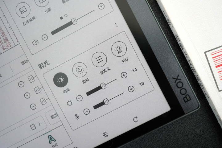 文石Tab10C Pro支持色温、亮度两组前光调节模组,分别支持25级调节。通过选择预设的前光模式或者直接手动调节双灯具体参数,即可轻松适配不同阅读场景的灯光需求。
